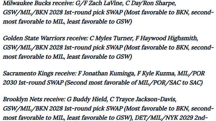 名记布雷特·西格尔提出的那个四方交易方案,像一颗投入平静湖面的石子,激起了层层涟漪。 这个方案牵扯到金州勇士、密尔沃基雄鹿、萨克拉门托国王和布鲁克林篮网,总共涉及八名球员和多个选秀权交换。 方案的核心流向是:勇士送出库明加、希尔德和TJD,最终得到印第安纳步行者的中锋迈尔斯·特纳以及迈阿密热火的前锋海伍德·海史密斯,同时还涉及一个2028年的首轮选秀权交换机会。 为了让这笔大交易成立,其他三队扮演了关键角色。